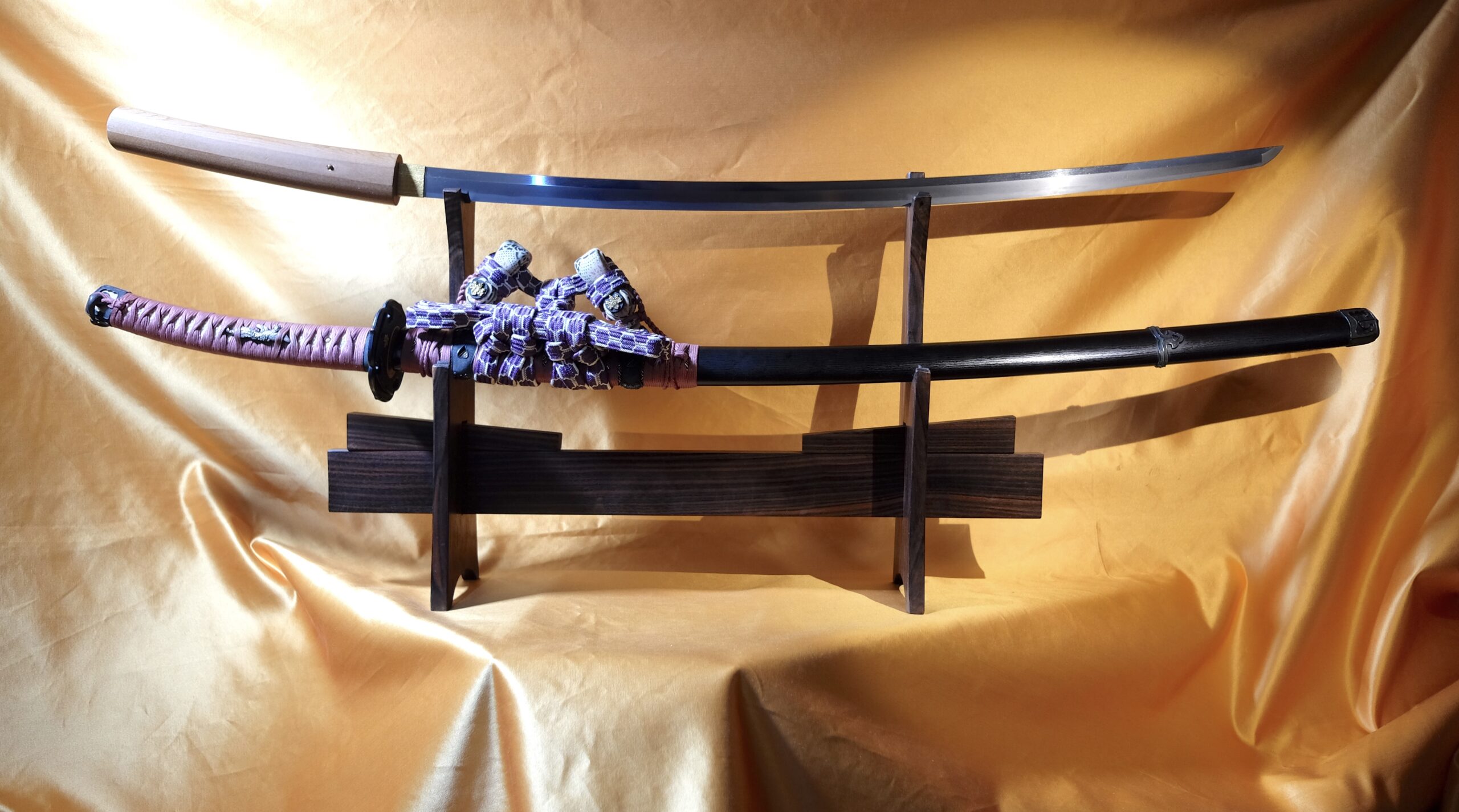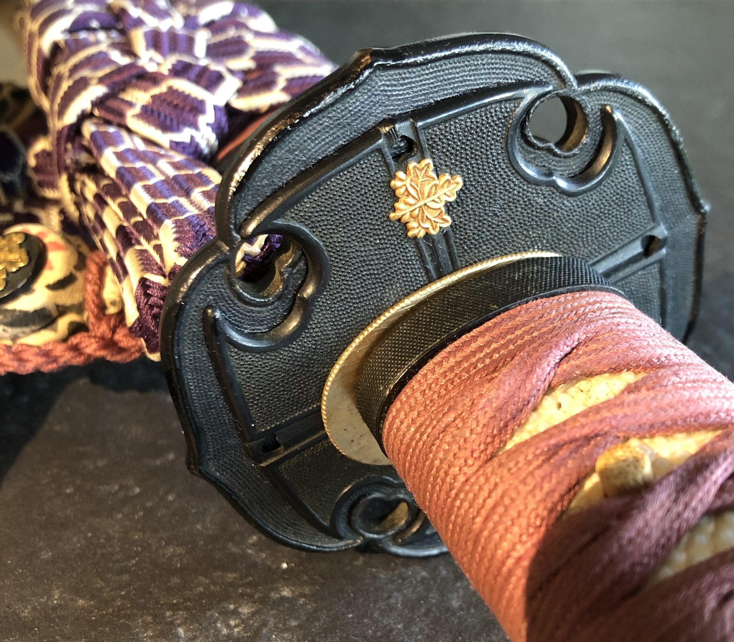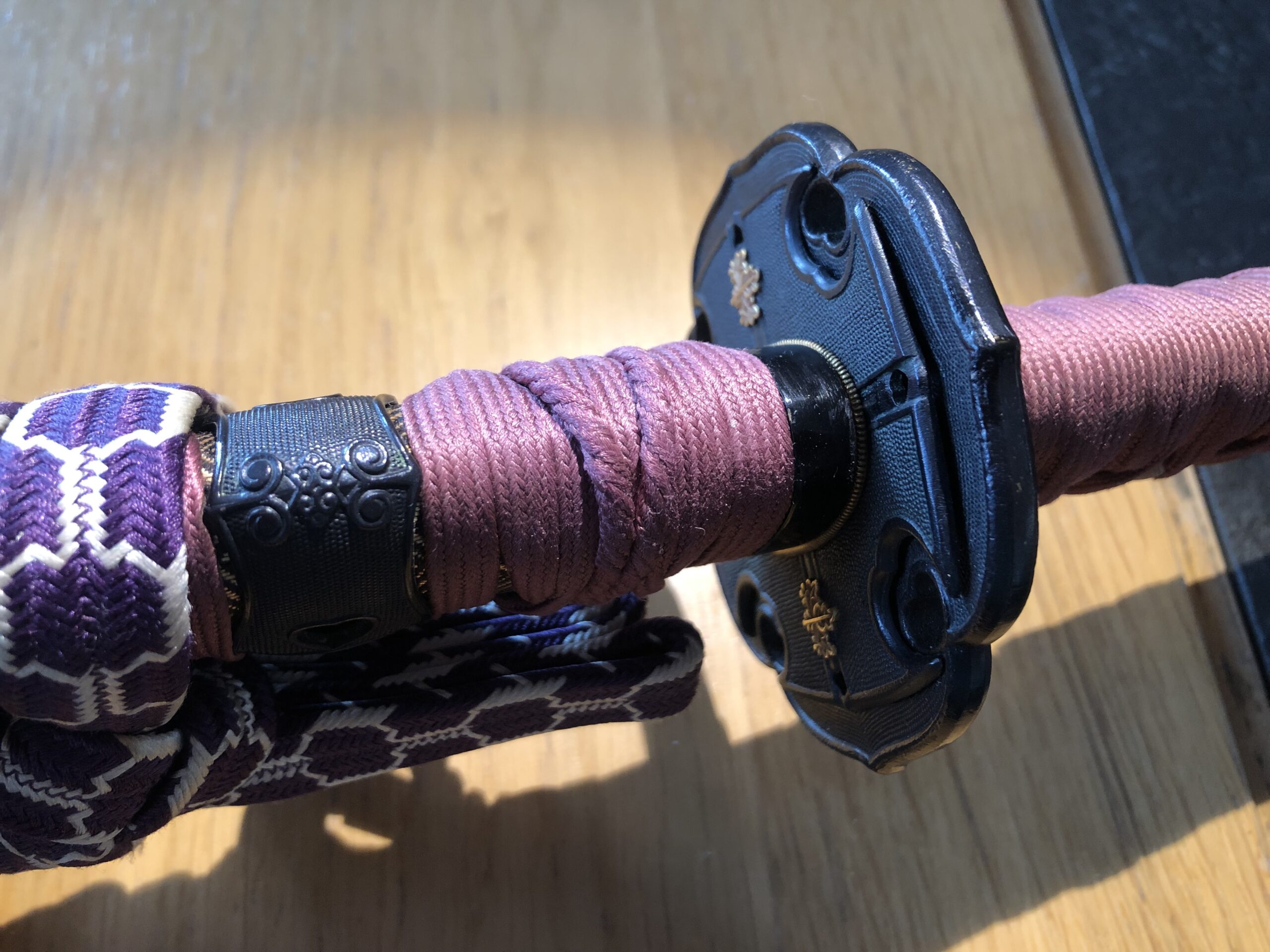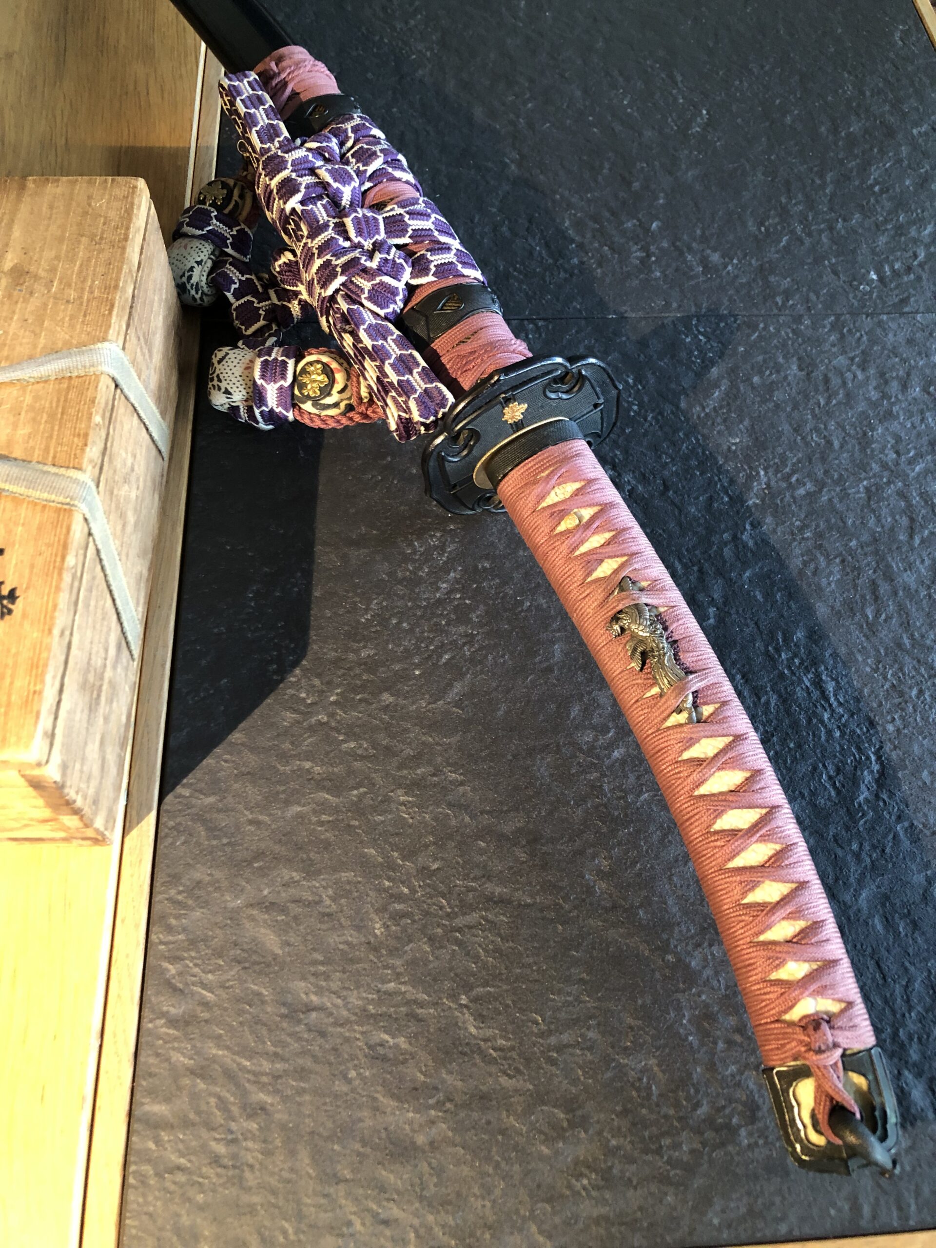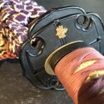 Zu dem Schwert gehört ein geschmackvolles „En Suite“ Itomaki No Tachi Koshirae, es stammt vermutlich aus der Edo-Zeit. Die Kodogu sind aus Shakudo mit Nanako und tragen goldenen Kiri-Mons auf dem Tsuba und auf den Sarute, auf dem Tsuka sind dazu passende Phönix-Menuki angebracht (der mythische Phönix lebt nur auf dem Kiri-Baum). Das Kiri-Mon gehörte früher zur Kaiserlichen Familie.
